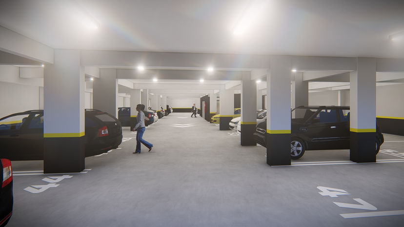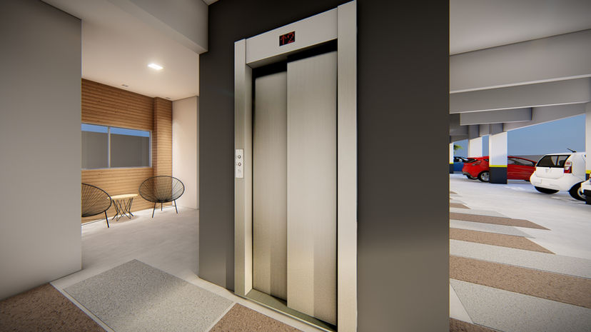 • Garagem coletiva totalmente coberta para a guarda de 34 automóveis no subsolo